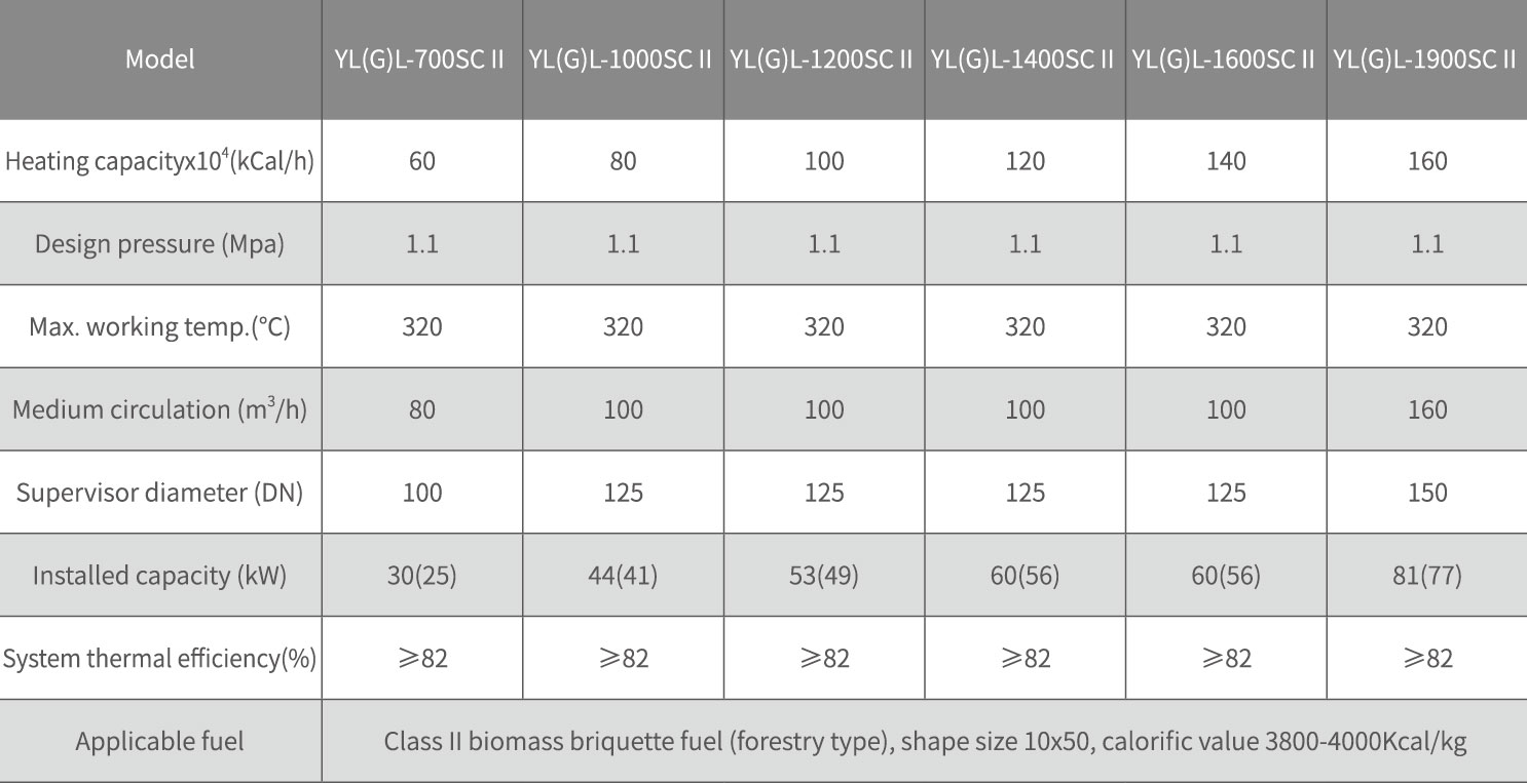 Heating power: 0.35MW - 2.3MW (30xl04Cal/hr- 200xl04Cal/hr) Specific parameters are shown in Table7