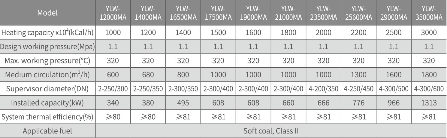 Heating power: 1.9MW - 35MW (160xl04Cal/hr - 3000xl04Cal/hr) Specific parameters are shown in Table8